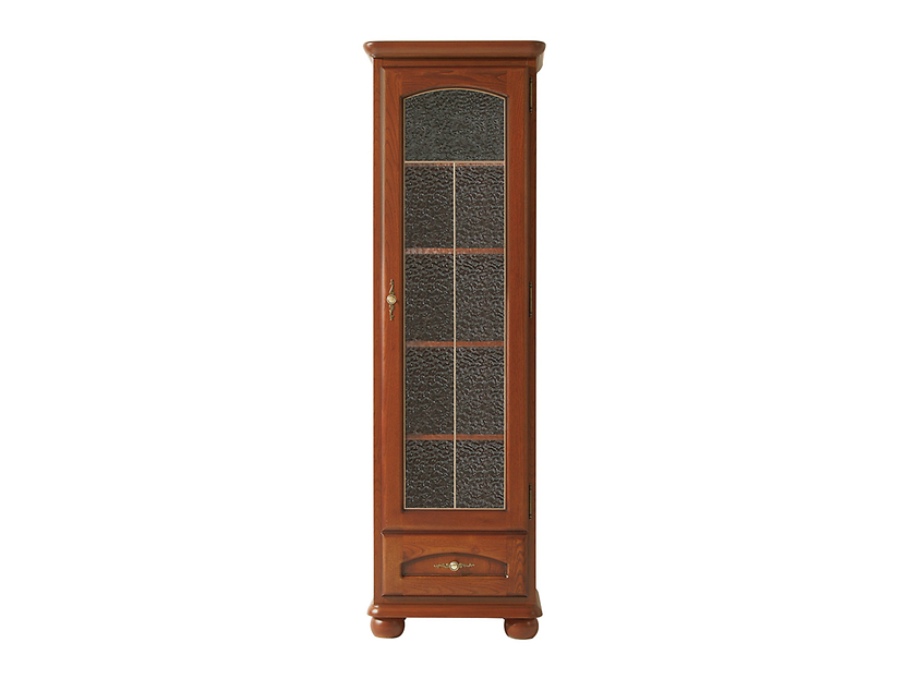 Et fint vitrineskap i imitert valnøtt og kastanje, med en praktisk skuff under. Sammen med de avrundede formene og messinghåndtakene blir møblet et klassisk innslag i hjemmet ditt. Døren er høyrehengt.