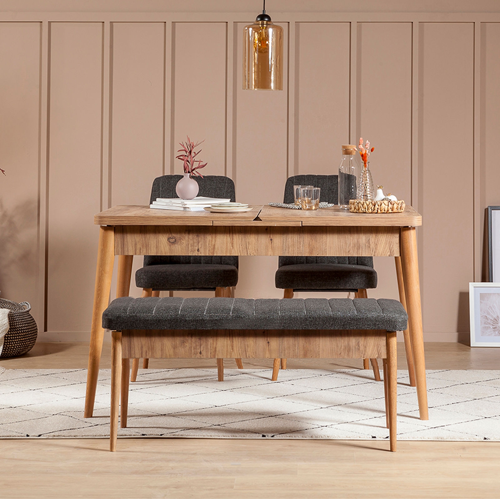 Spisegruppe av melaminbelagt sponplate. Bein av agnbøk.