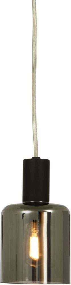 Vinduslampe i svart metall og glassskjerm i røykgrå. Enkelt oppheng med krok.