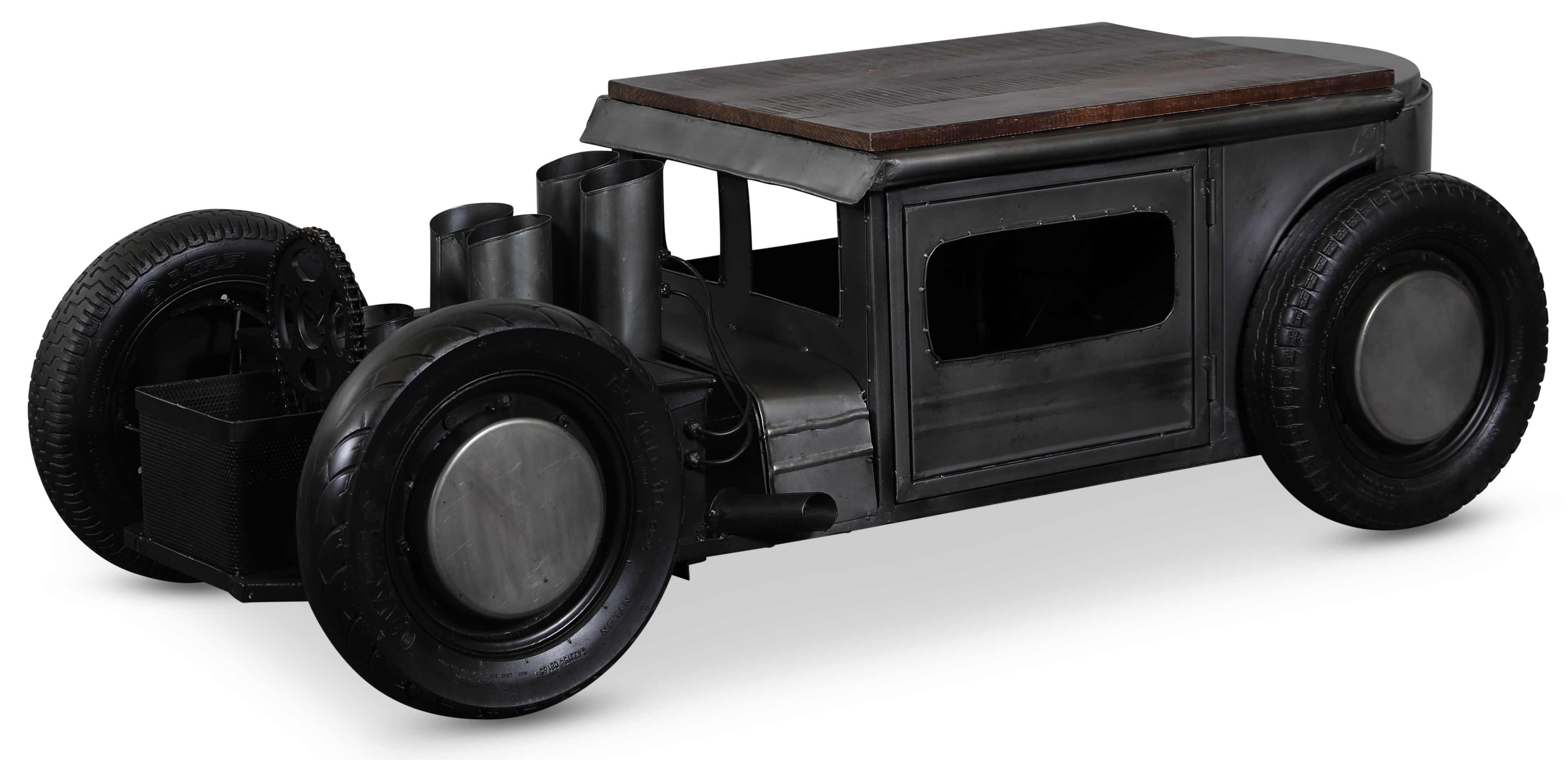 Stilig vintage salongbord i form av en klassisk formel bil. Laget av metall med topplate av mangotre. Vinstativ i motoren for 4 flasker.