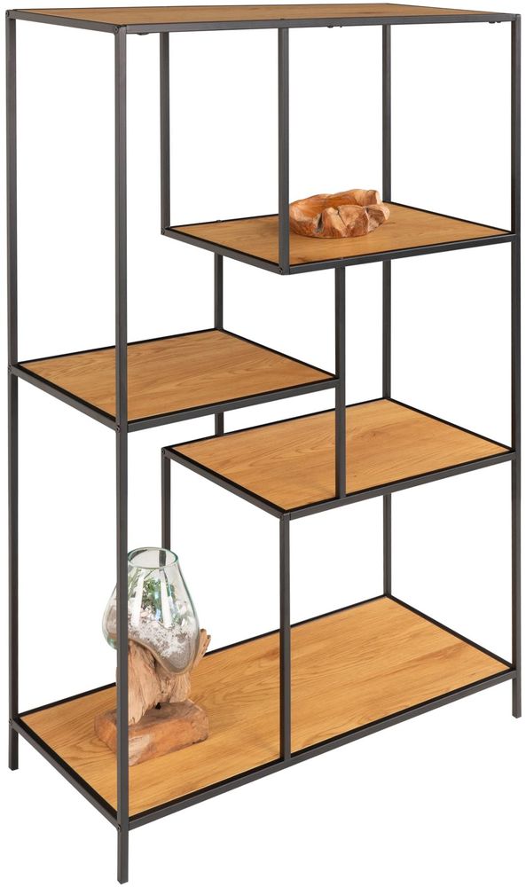 Hylle i svart med hyller i eik imitasjon.