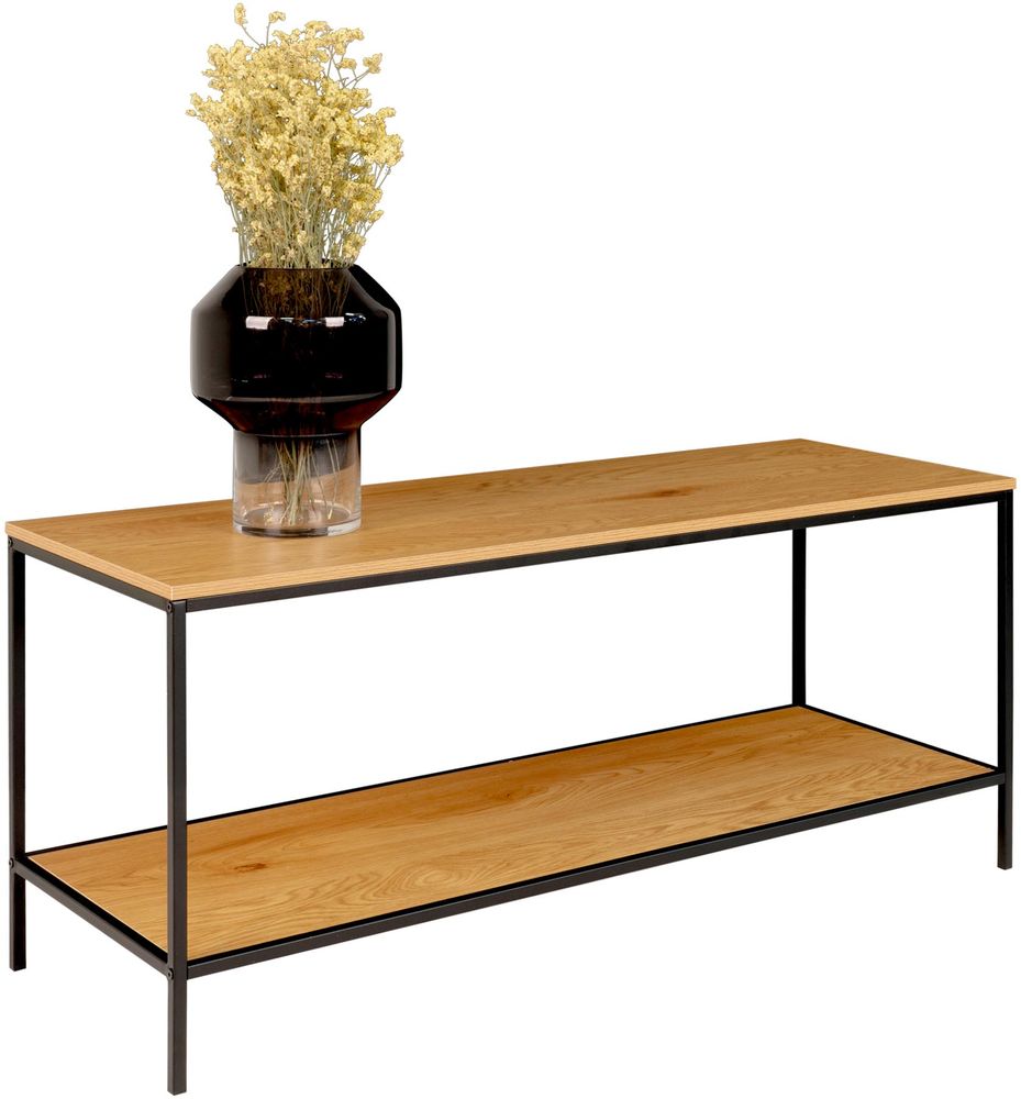 Tv-benk i svart med hyller i eik imitasjon.