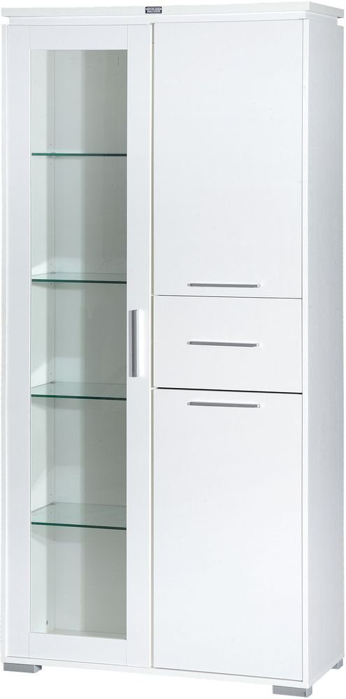 Prydelig vitrineskap med gode oppbevaringsmuligheter. Skapet er laget av sponplate / MDF i hvitt med mønster. Glassdør samt skap og skuff. Finnes også i svart utførelse.