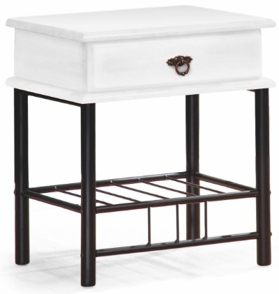Stilfullt nattbord med en klassisk design. Understellet er tilvirket i svartmalt metall med et praktisk hylleplan for oppbevaring av blader og bøker. Bordplaten er tilvirket i massivt hvitlakkert tre, med en praktisk skuff for oppbevaring.