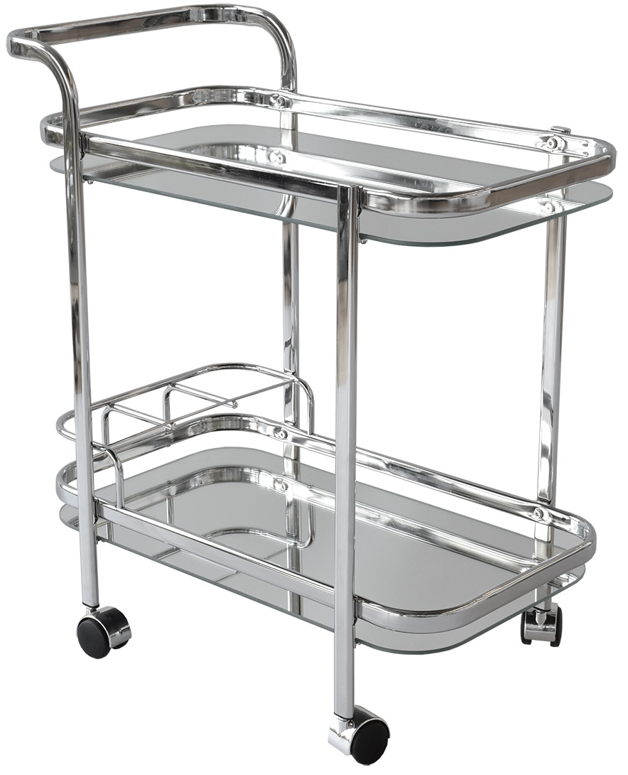 En klassisk serveringvogn i forkrommet metall. Toppskive i speilglass gir en luksuriøs følelse.