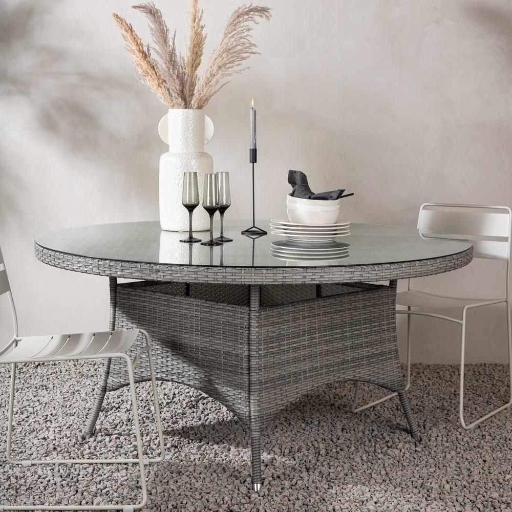 Volta er et rundt spisebord i robust design som gjør et slitesterkt og sjarmerende inntrykk! Bordplaten er i stilig glass og understellet i slitesterk, grå syntetisk rotting. Ordne møbler i vinterhagen eller på uteplassen og la utemiddagene bli dagens høydepunkt - her havner ingen på kanten! Pleieråd: Kunstig halm er et plastmateriale som passer perfekt til vårt skandinaviske klima. Materialet er UV-bestandig og værbestandig. At det er UV-bestandig gjør at møblene ikke falmer, men vi anbefaler alltid å oppbevare møblene under et møbeltrekk eller på annen måte tørt og kjølig - for å forlenge levetiden.
