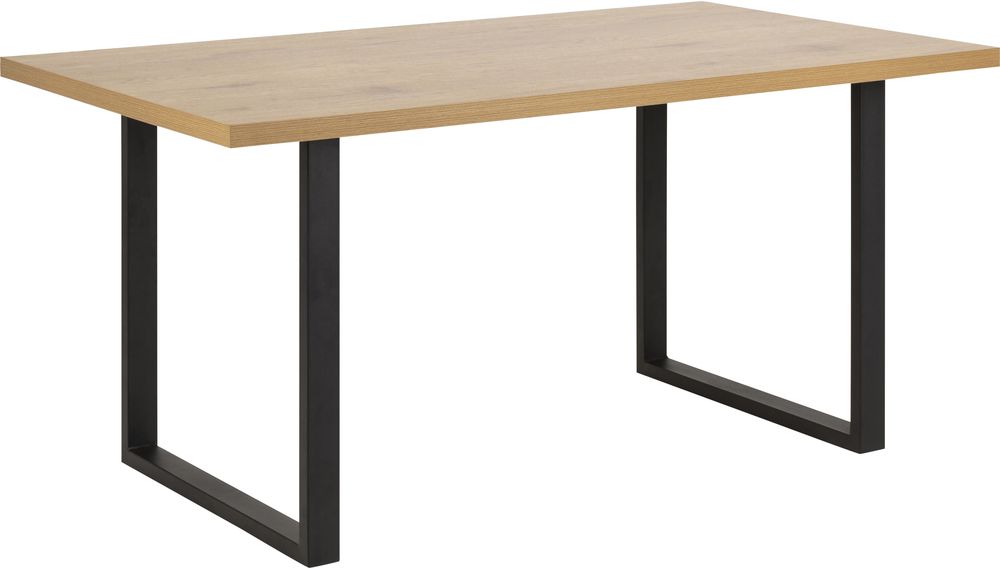 Spisebord med bordsplate laget av melamin med eikeimitasjon. Rammen er laget av svart pulverlakkert metall.