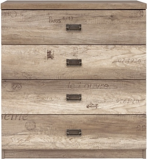En fin kommode i eik og en grå front med dekorative håndtak. Kommoden har fire praktiske skuffer. Som en fin detalj finnes det diskret grafiske ord og tall på møblene, som en rød tråd gjennom hele møbelserien