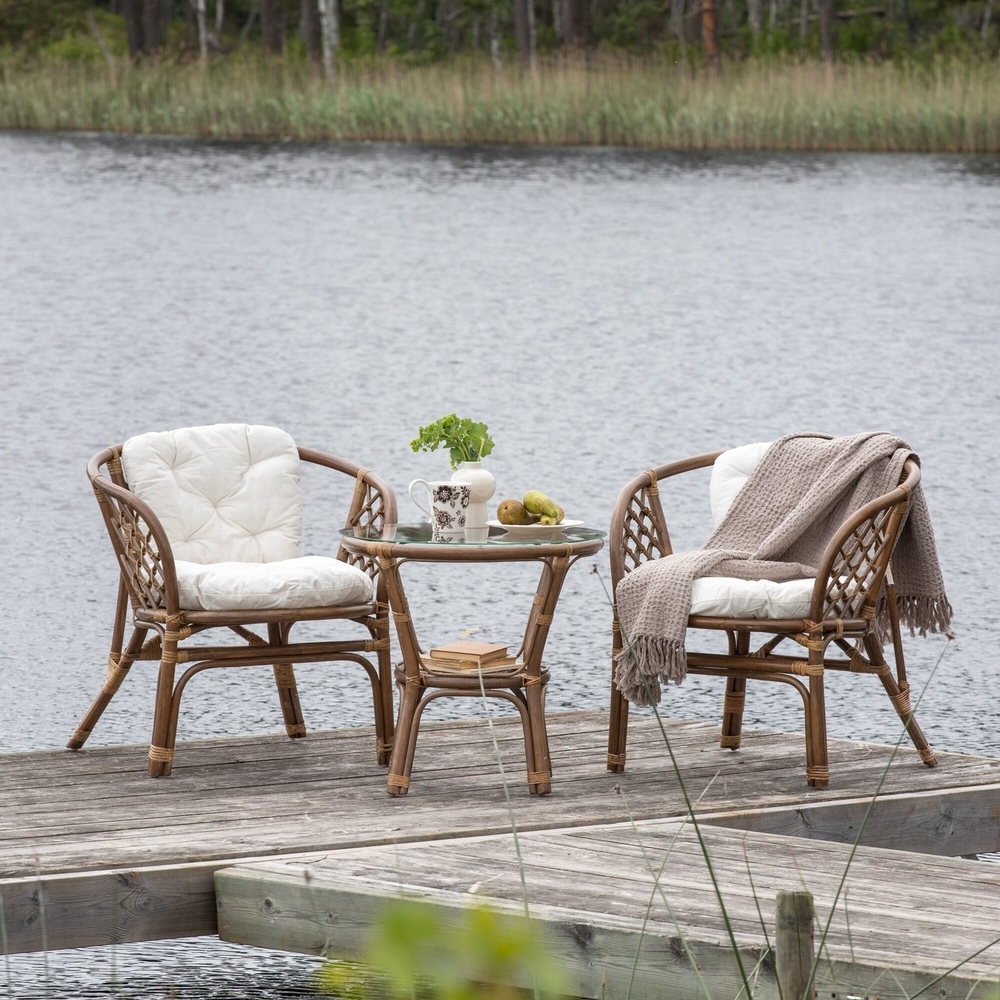 Mysigt caféset i ett klassiskt utförande tillverkat i stark och tĺlig naturrotting med lasyr som behĺller rottingens karaktär, passar perfekt pĺ den inglasade uteplatsen eller den lilla balkongen. Cafésetet bestĺr av tvĺ karmfĺtöljer med fina detaljer inklusive vita pickerade dynor samt ett runt cafébord med en bordsskiva av glas och en liten avlastningshylla. Som extra touch är bindningarna i en avvikande nyans. Det naturliga materialet ger varje enskild möbel en unik karaktär. Ett tidlöst caféset som drar blickarna till sig.
