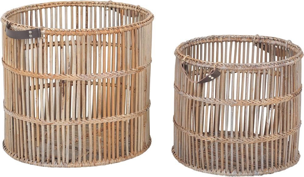 Sett med 2 prydlige sylinderformede kurver av gråkalket flettet bambus med skinnhåndtak.