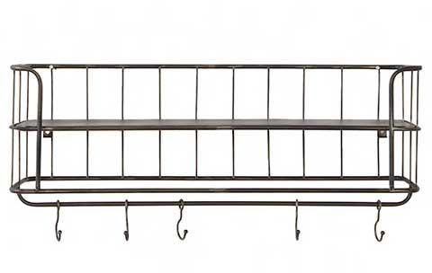 Smart oppbevaring i form av en vegghylle. Laget av jern og metall og tilbyr både hylle og kroker for opphenging. Hyllen tilfører et industrielt preg på hjemmet.