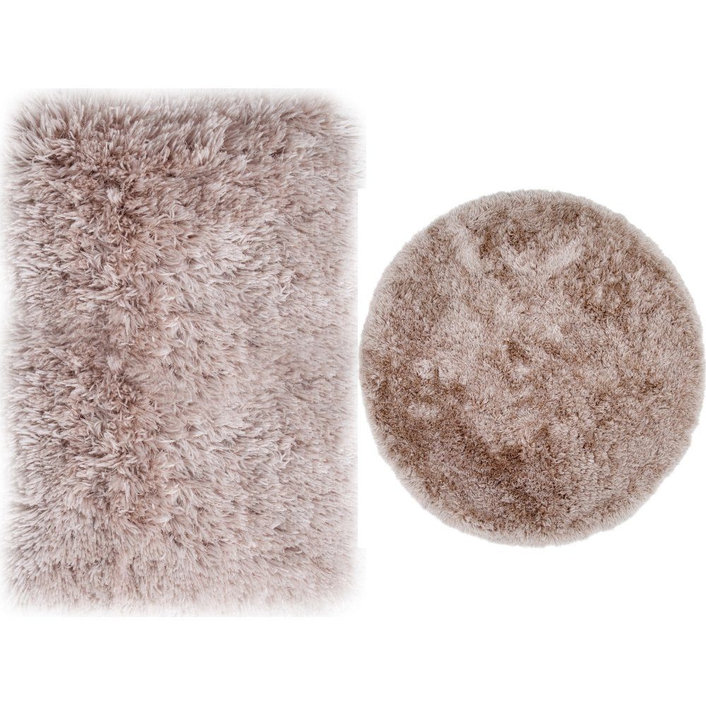 Polyesterteppe i en moderne, beige fargetone. Den høye luggen på teppet skaper en behagelig glans som skinner avhengig av hvordan lyset treffer.