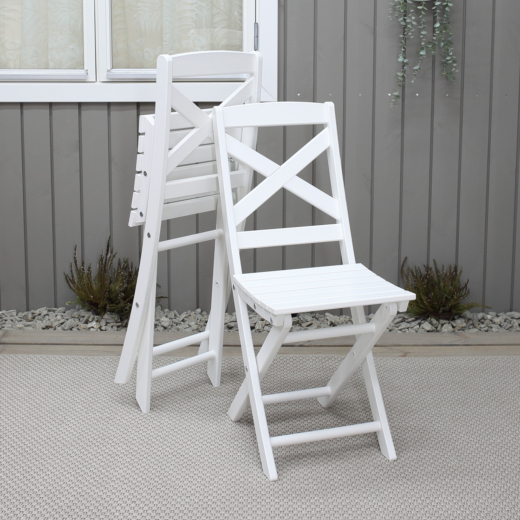 Wilma er en sammenleggbar stol i hvitmalt furu, klassisk design. Sammenleggbar slik at den praktisk talt kan oppbevares når den ikke er i bruk.