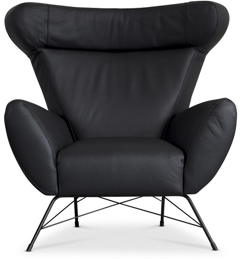 Winnston er en moderne ørelapplenestol for både hjemmemiljø og offentlige miljø. Lenestolen er kledd i et mykt svart skinn som passer inn i de fleste omgivelser. Svartlakkert metallunderdel. Fotskammel finnes som tillegg i samme serie.