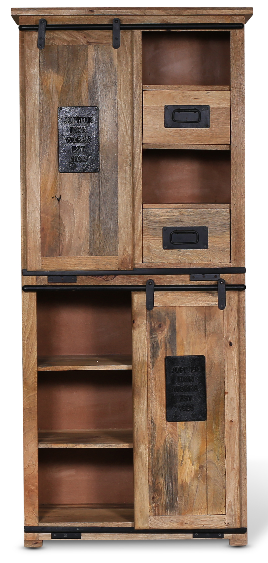 WoodCraft er en serie velproduserte vintagemøbler i mango og metall med riktig følelse. Skap med to skyvedører på skinner som skjuler praktisk oppbevaring. Innebygde skuffer for oppbevaring.
