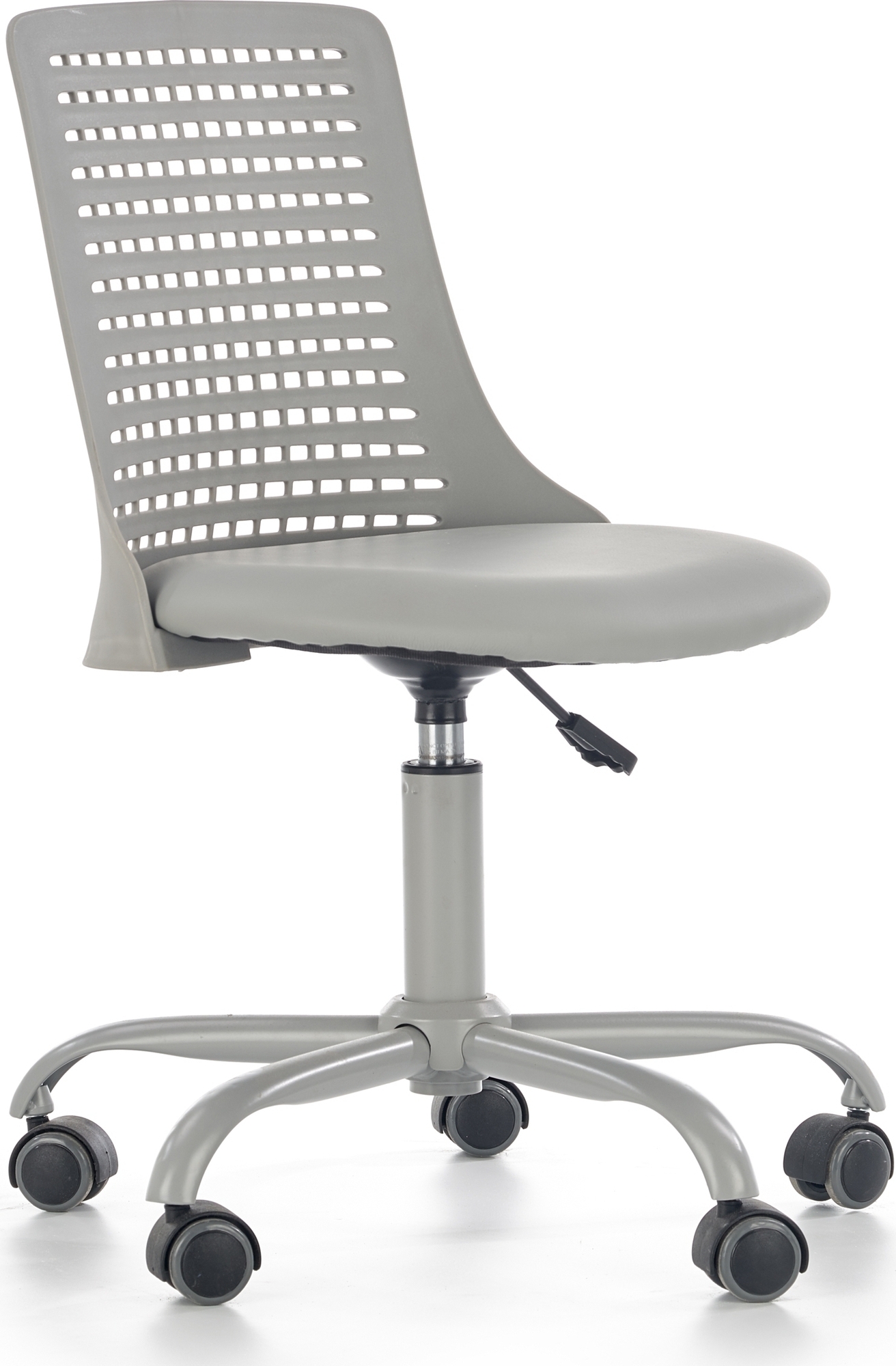 En fin kontorstol for barn med en stilren design. Kontorstolen er tilvirket av plast og metall med en veldig behagelig kledning på setet av kunstskinn for maksimal komfort. Setehøyde er lett justerbar med hjelp av spaken under setet og stolen er i tillegg lett flyttbar med hjelp av hjulene på stjernefoten.